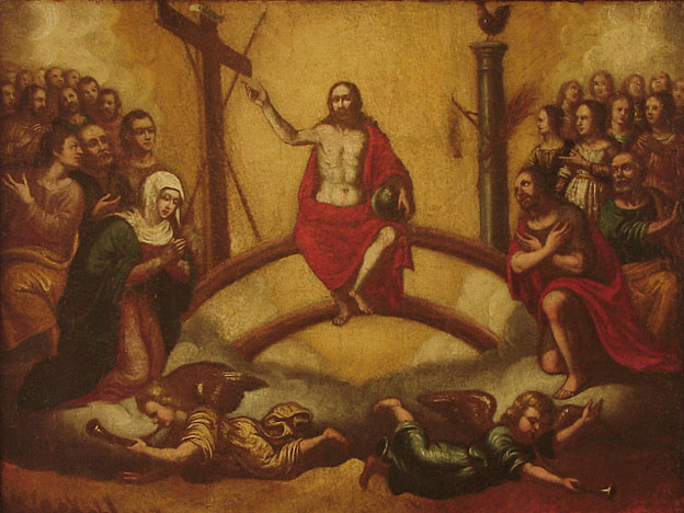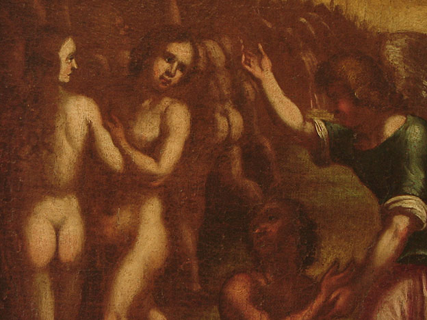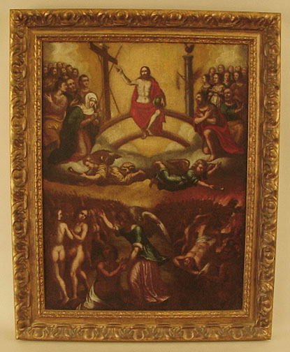 (31) "The Last Judgment," an unsigned 17th or 18th Century Spanish painting; oil on canvas. One notices the influence of Bosch and other early Dutch and Flemish artists in this Spanish painting. The painting is wax-lined, with extensive restoration throughout. Measurements: 19 by 26 inches; with frame, 30 x 24. (e-mail Jack for a price, additional photos or other information)