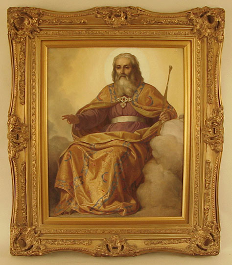 (33) "God the Father," by Vicenzo Morani (Italian, 1809-1870); oil on canvas. Morani studied in Naples under Angelinin and Guerra; he was influenced by Overbeck, and worked predominantly for the Naples court. This is the original canvas, and it has some repairs with patches on the back. Measurements: 29 by 24 1/2 inches; with frame, 42 x 36. Morani's glorious work: SOLD to SANDIE!