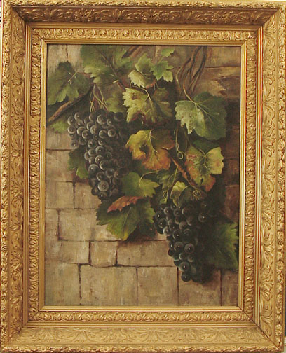 (35) This beautifully rendered (unsigned) still life with grapes and leaves brings to mind, stylistically, the work of the California artist Edwin Deakin. Presented in its original frame, measuring 24 high by 18 wide, 32 by 25 including the frame. (e-mail Jack for a price, additional photos or other information)