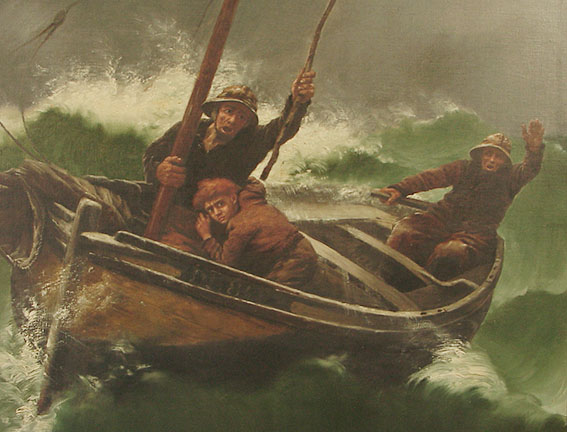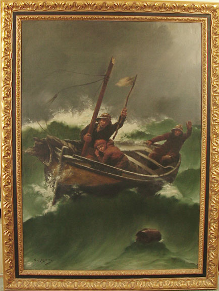 (37) "Au Secours" by Georges-Jean-Marie Haquette (French, 1854-1906); oil on original canvas with a few small repairs. Haquette, a student of Millet and Cabanel, made his debut in the Paris Salon in 1875 and later became a professor at the School of Decorative Arts in Sevres. Haquette received honorable mention at the Paris Salon in 1878 and a bronze medal in 1890. He exhibited at the Exposition Universalle in 1901. Measurements: 49 by 35 inches; with frame, 55 by 42 inches. (e-mail Jack for a price, additional photos or other information)