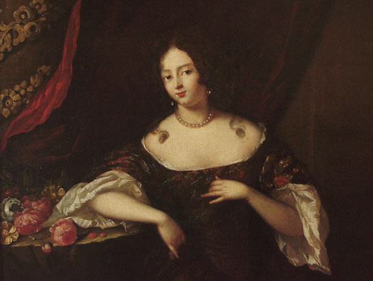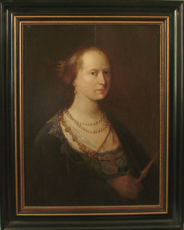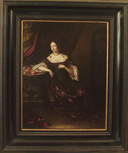 (38) Aleyda Wolfsen's "Portrait of a Lady with Flowers." Wolfsen (Dutch, 1648-1690) studied under Caspar Netscher, whose works are often confused with hers; she was one of the few noteworthy female artists in 17th Century Holland. In 1674 she was commissioned to paint the portrait of Prince Guillaume III. Her work is represented in the Hague as well as the Hermitage in Leningrad. On of her paintings is illustrated in "The Obstacle Race," by Germaine Greer. Measurements: 23 1/2 by 18 1/4; with frame, 33 by 27 inches. (e-mail Jack for a price, additional photos or other information)