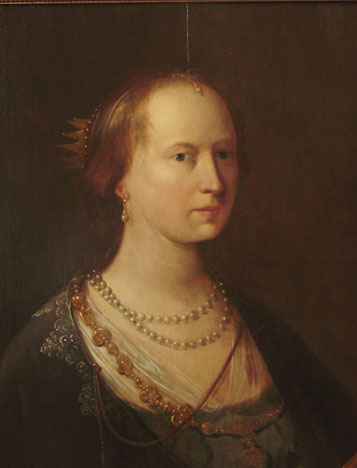 (39) Pieter Potter (Dutch, 1597-1656) painted "Portrait of a Lady with Gold Necklace" on panel, which cracked down the center over the centuries (it's been well restored and is barely visible to the eye, but presents itself in photographs). Potter painted still lifes, battle scenes, genre pictures and portraits. His work was influenced by Duck, Codde and Duyster, and may be found in the National Gallery in London as well as the Hermitage in Leningrad. Measurements: 24 1/2 by 18 1/2 inches; with frame, 30 by 24 inches. (e-mail Jack for a price, additional photos or other information)