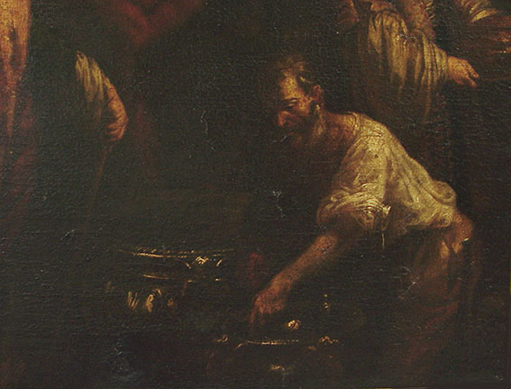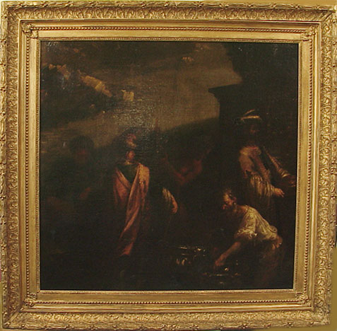 (41) "Figures Paying Tribute" is attributed to Giovanni-Andrea Donducci (Italian, 1575-1655). Donducci studied at the Carracci Academia during the early 1590's; he then traveled to Rome and befriended Agostino Tassi. In 1613 he returned to Bologna where he received numerous important commissions. His work is repesented in museum collections world-wide. This painting has an old lining and varnish; there are some repairs. Measurements: 28 1/2 by 29 1/4 inches; with frame, 35 by 35 1/4. (e-mail Jack for a price, additional photos or other information)